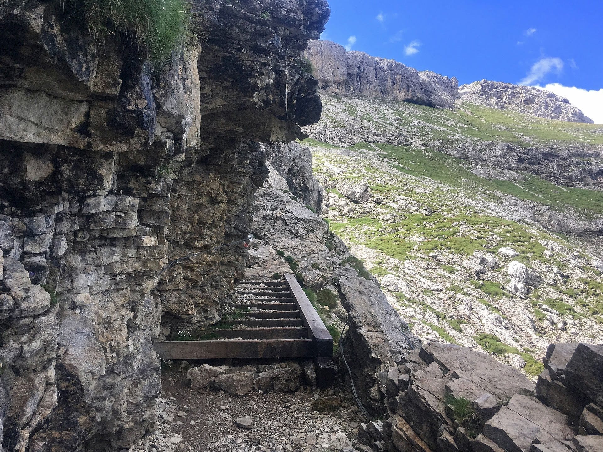 • Самая экспонированная часть пути. Узкая тропа под скалой, рядом обрыв. Здесь натянуты страховочные тросы (via ferrata style).