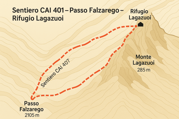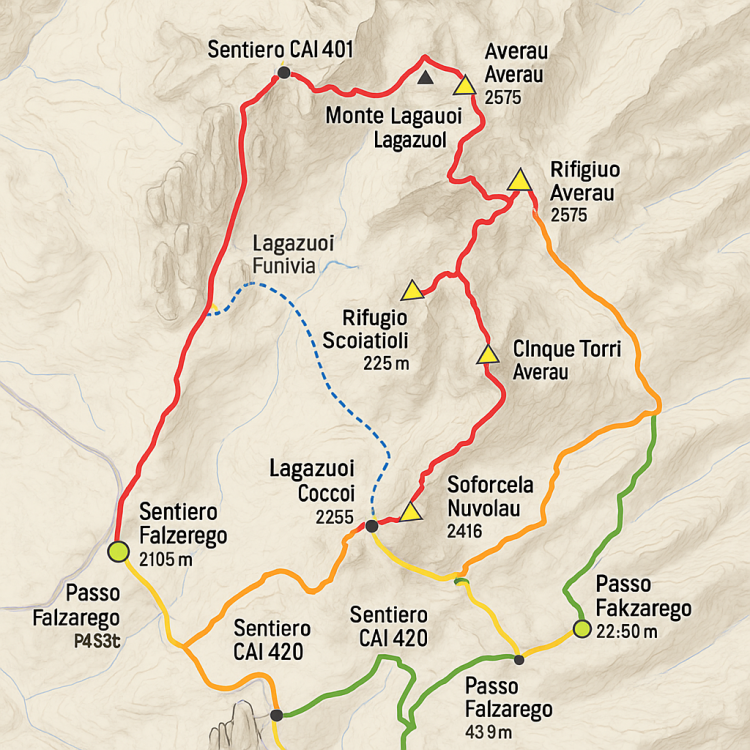 🟥 CAI 401 | Sentiero del Lagazuoi | Passo Falzarego (2105 м) | Rifugio Lagazuoi (2752 м) | 3.5 км | +650 м | 1.5 – 2 ч | 🟡 Средняя | Классический подъём, смотровые площадки, панорама Tofane | |