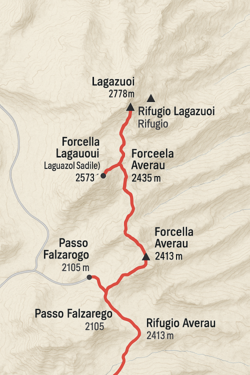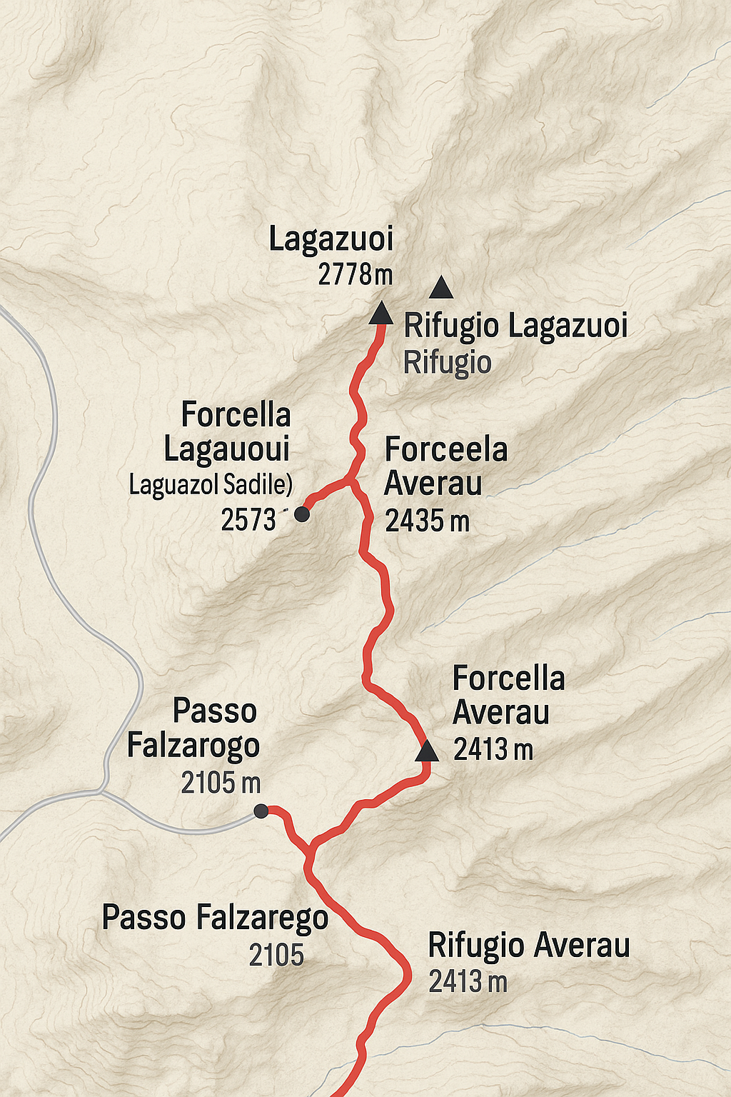 🟡 Ключевые точки и перевалы: Passo Falzarego, Forcella Averau, Forcella Nuvolau