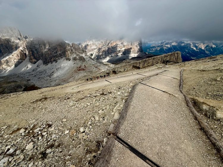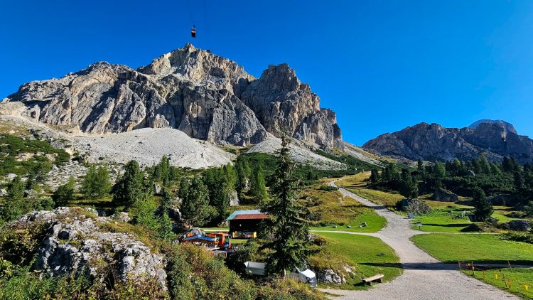 – Тропа выводит на плато возле верхней станции канатной дороги и Rifugio Lagazuoi.