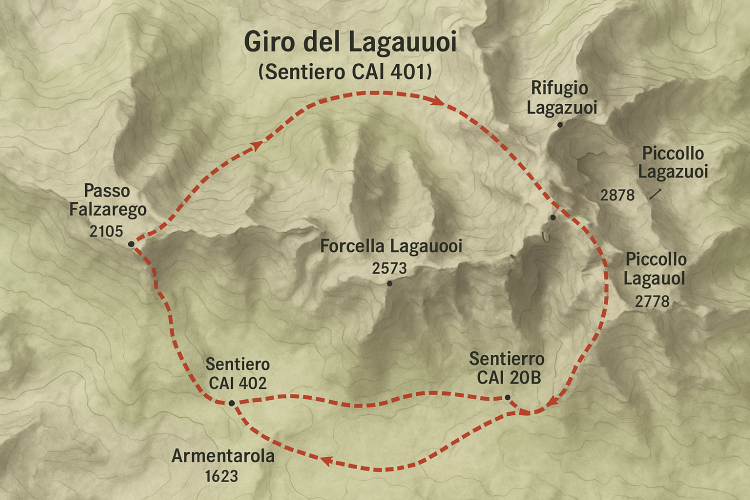 📍 Комбинированный маршрут: CAI 401 → Rifugio Lagazuoi → 402 → 20B → обратно к Passo Falzarego или Armentarola