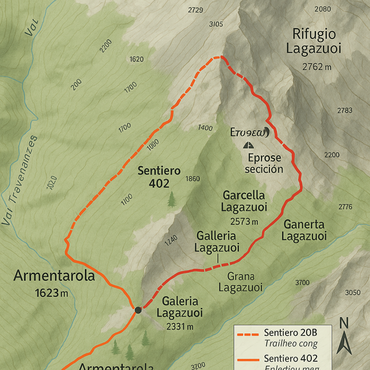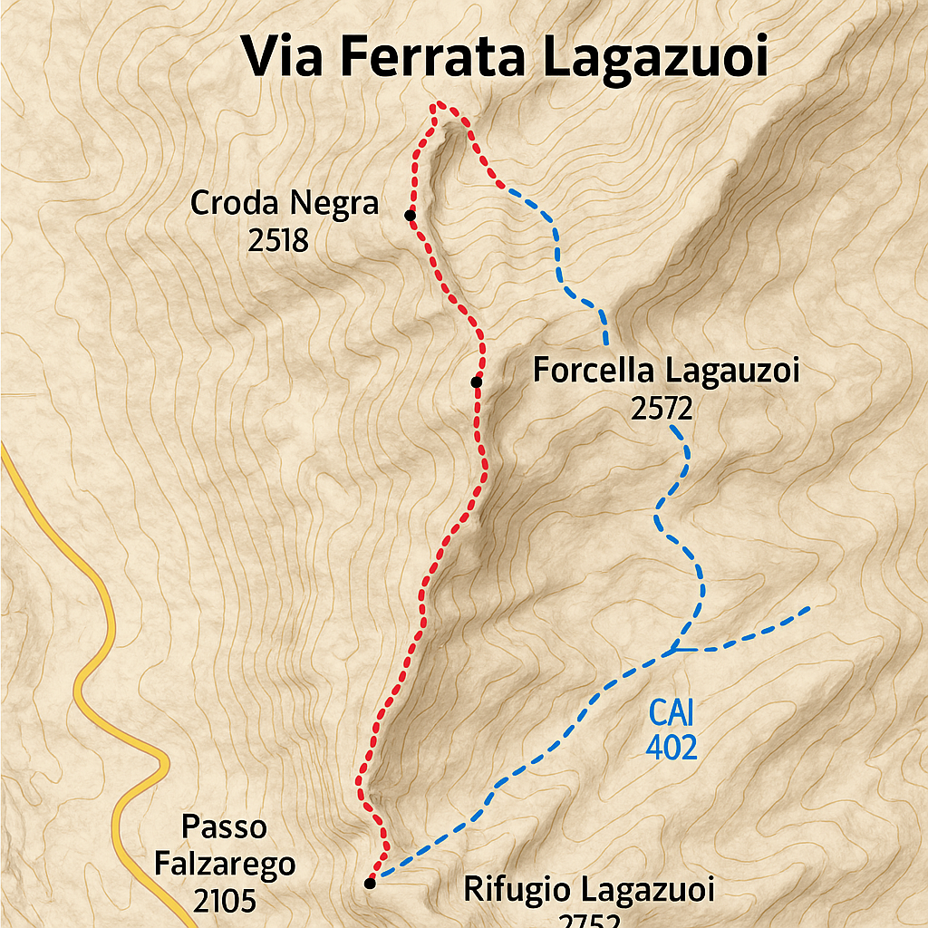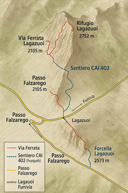 🔵 Синяя пунктирная линия (CAI 402) | Пешеходная тропа Sentiero CAI 402 | Альтернативная тропа для подъёма или спуска без использования via ferrata. Соединяет Forcella Lagazuoi (2573 м) с Rifugio Lagazuoi и может использоваться для возвращения после прохождения ferrata. |