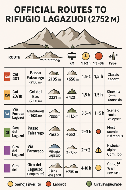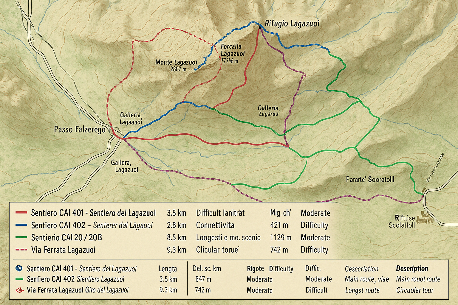 🟣 Giro del Lagazuoi (круговой маршрут) | CAI 401 → Rifugio Lagazuoi → 402 → 20B → обратно к Passo Falzarego или Armentarola | Passo Falzarego / Armentarola | Rifugio Lagazuoi (2752 м) | 9 – 10 км | +750 м | 4 – 5 ч | 🟡 Средняя | Комбинация 401 → 402 → 20B, обзорный маршрут |