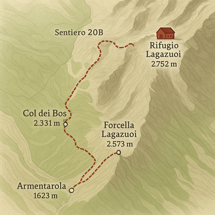 📍 Маршрут: Armentarola (1623 м) → Col dei Bos (2331 м) → Forcella Lagazuoi → Rifugio Lagazuoi