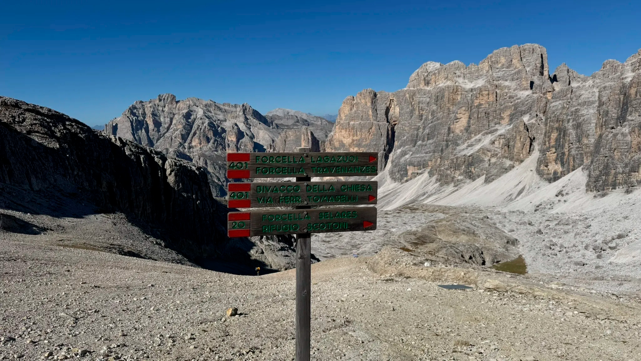 Начало: От парковки и станции канатной дороги на перевале Passo Falzarego нужно найти указатели «Sentiero 401 – Rifugio Lagazuoi». Они установлены прямо у нижней станции фуникулёра.