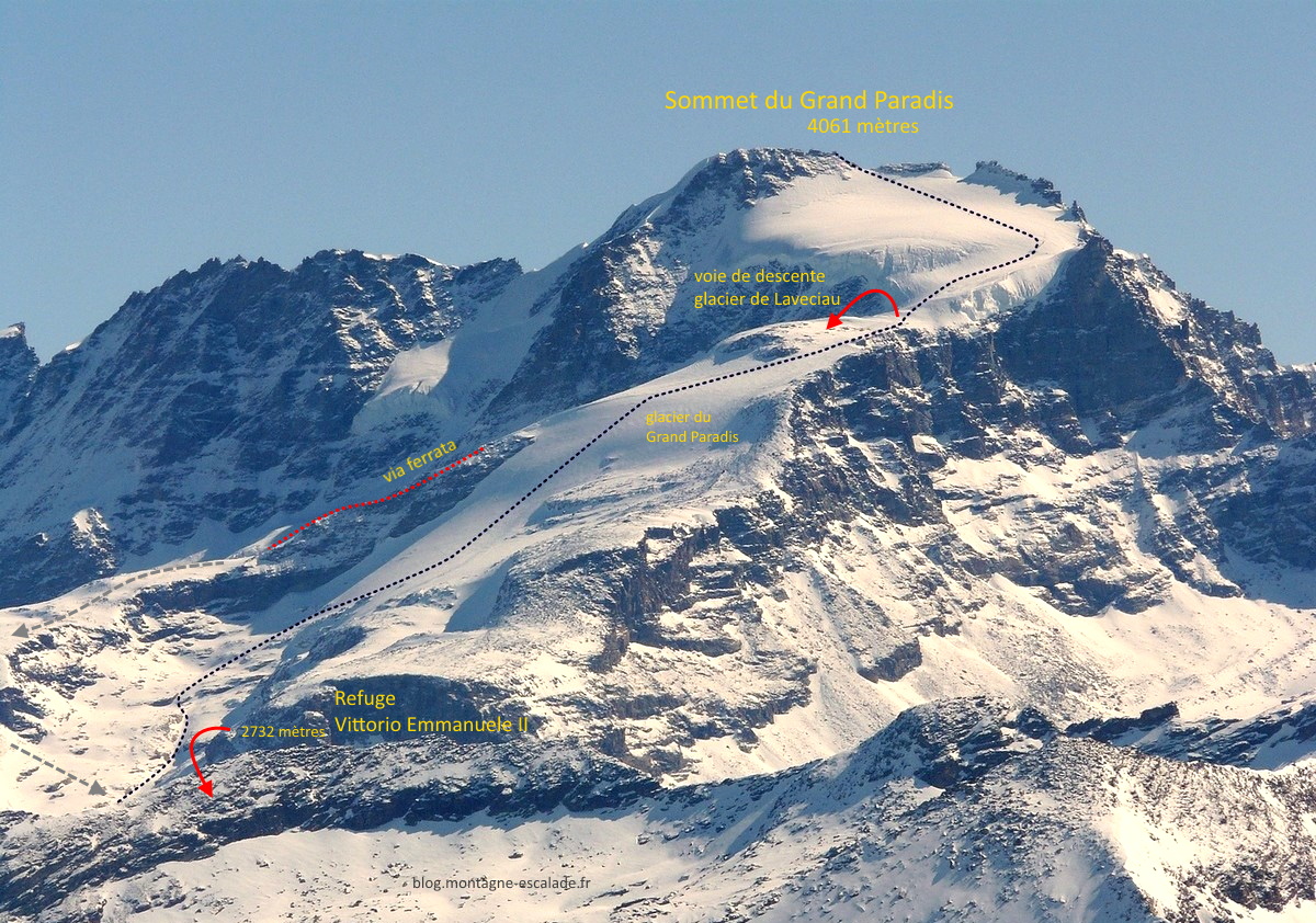 Классический маршрут (1Б к.т.) на вершину Gran Paradiso (4061 м) не представляет особых технических трудностей. Крутизна ледника весьма умеренная, опасность срыва с падением на большую глубину практически исключена, а сама скальная башня вершины хорошо оборудована скобами и шлямбурными крючьями. Восхождение отлично подходит для начинающих альпинистов или в качестве первого самостоятельного восхождения в больших горах с альпинистским снаряжением.