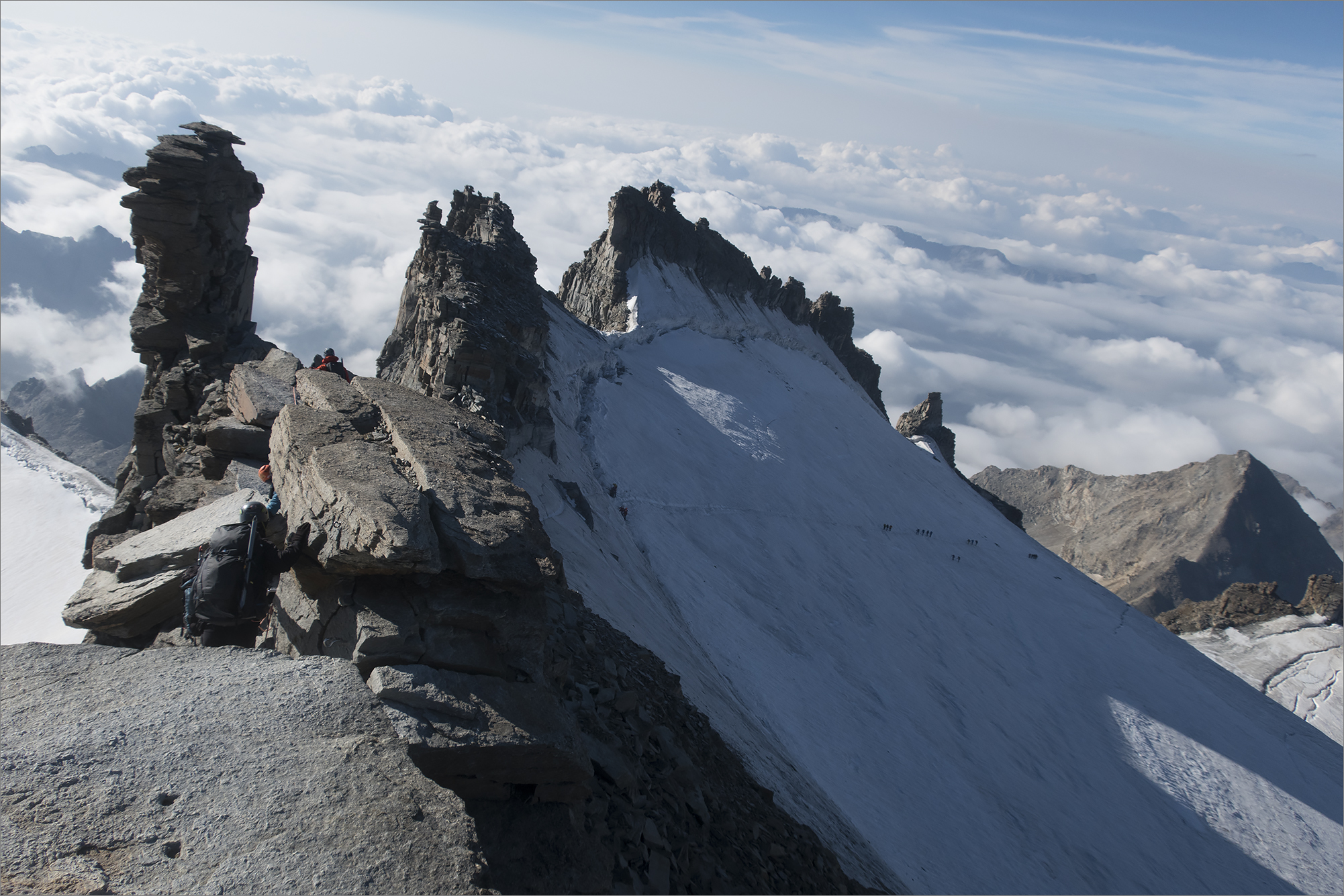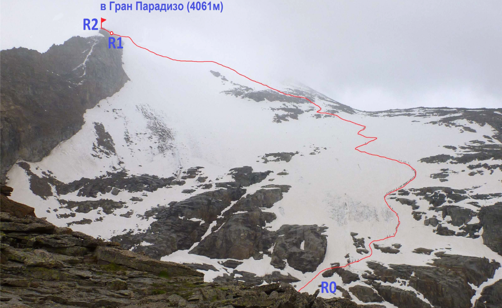 R1-R2: От большой скалы (жандарма) с мемориальными табличками траверсом влево 50 м. Отсюда видно статую Мадонны. Обойти скалы справа, траверсом вдоль стеночки. Для страховки присутствуют три стационарных шлямбурных крюка. Помимо этого можно организовывать свои страховочные точки (рельеф позволяет). На вершинной площадке могут разместиться 6-8 человек. У металлического постамента статуи есть специальные места для крепления перил и организации страховки. Самая высокая точка Гран Парадизо (4061 м) находится дальше в 50 метрах после провала в северо-западном гребне, но традиционно считают конечной точкой маршрута высоту, где стоит статуя Мадонны (4056 м).