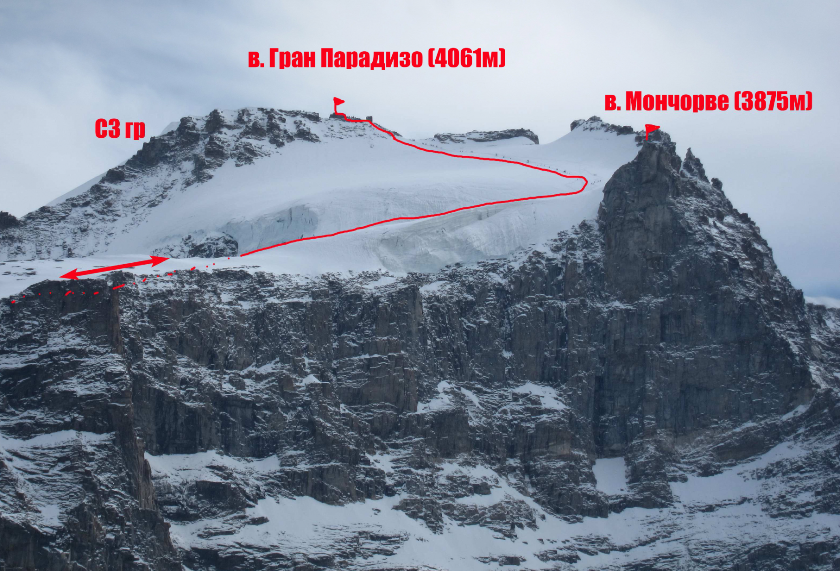 R0-R1: От бараньих лбов двигаться вверх вправо. Скальные выходы западного гребня оставить справа. Выйти на выполаживание. Перед вторым взлётом будет небольшая гряда небольших скальных островков. Преодолев их, двигаться прямо вверх по снежно-ледовому склону 25-30°. Через 300 метров небольшое выполаживание, видно вершину Мончорве справа. Подняться до большой ложбины за Мончорве (3875 м). Дальше начинается длинный подъём по взлёту склона юго-восточного гребня. По 20-30° снежному склону подняться к предвершинным скалам.